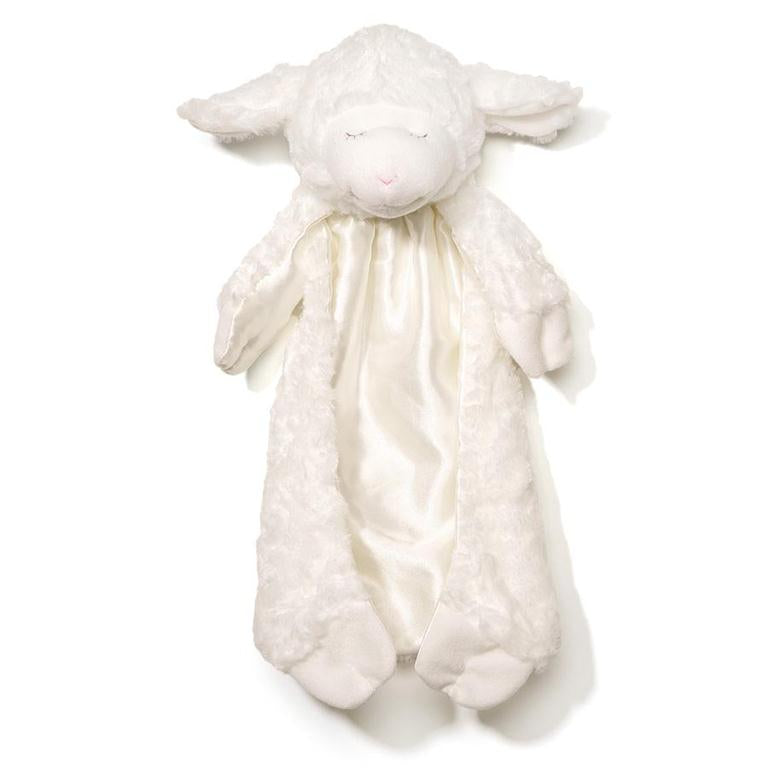 This 16" lovey combines a stuffed animal with a baby blanket featuring a satin underside for added tactile sensation.