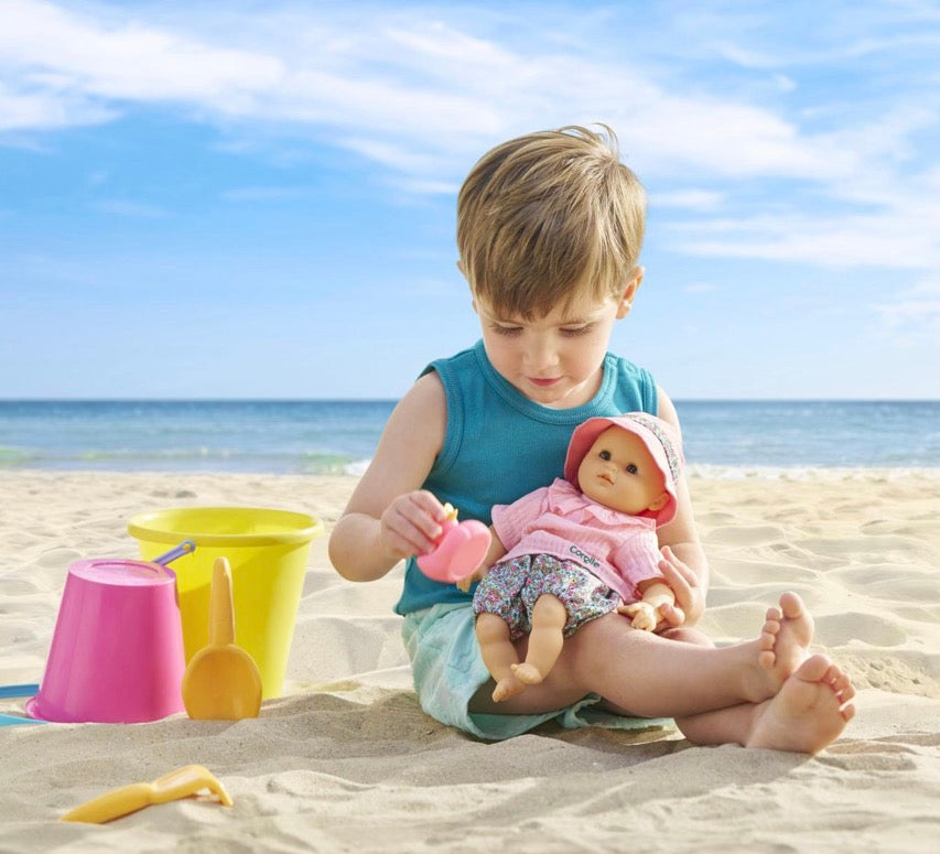 Dressed in a cotton gauze T-shirt, flowery bloomers, and a matching pink hat, this adorable doll is ready for a full day of fun in the sun AND water.