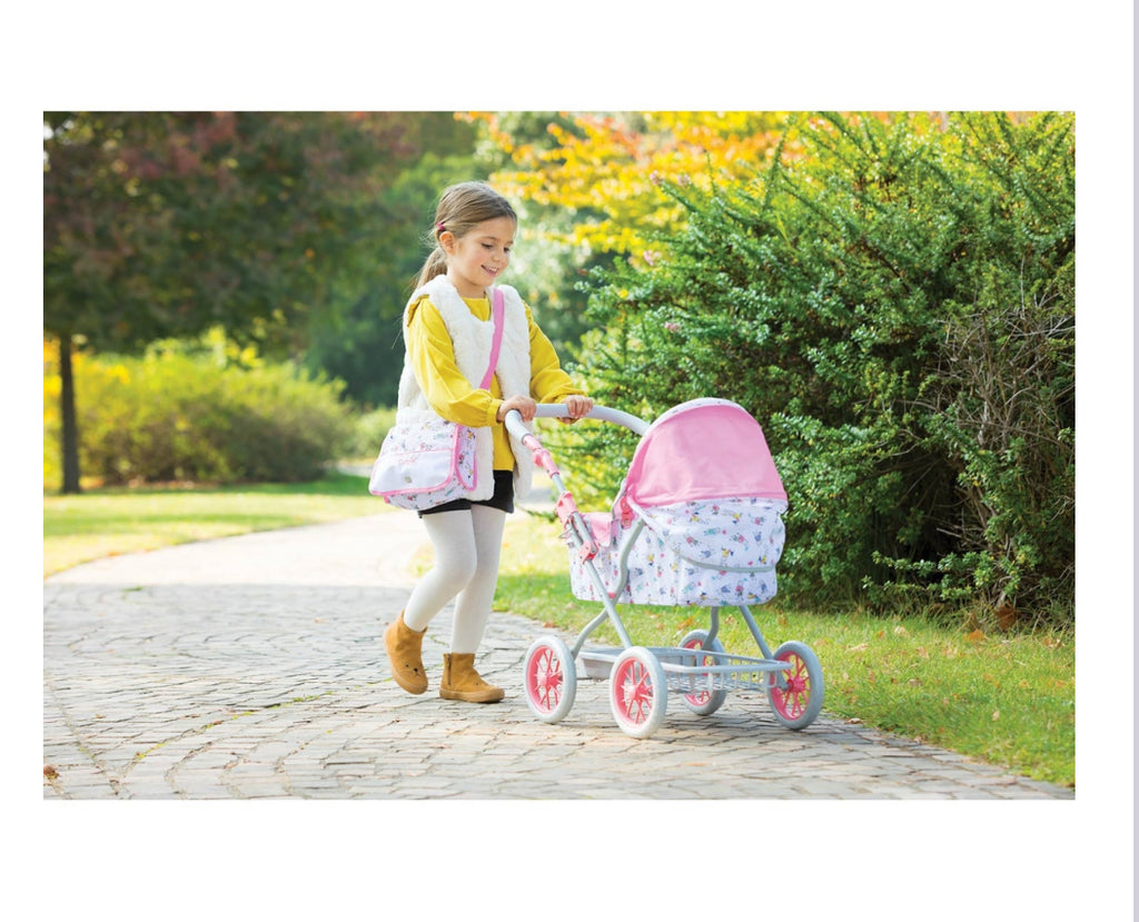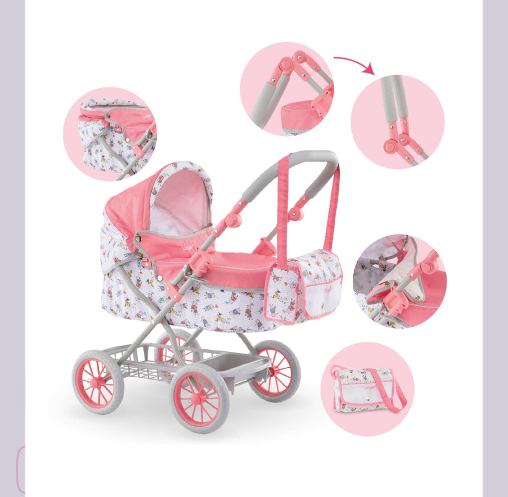 It's time for a walk and make-believe moms and dads will love taking their favorite 14" - 20" baby doll for a stroll in style. Its handle height is adjustable from 14" to 29.5" to accommodate children as they grow. It has an adjustable hood, a storage basket for baby's things, a removable bassinet cover and comes complete with a matching nursery bag. When playtime is over, the carriage folds easily for space-efficient storage.