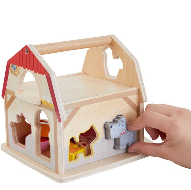 A shape sorter with an animal theme, the Farm Sorting box helps kids learn hand-eye coordination while playing farm with this sturdy wooden box. Ages 1+