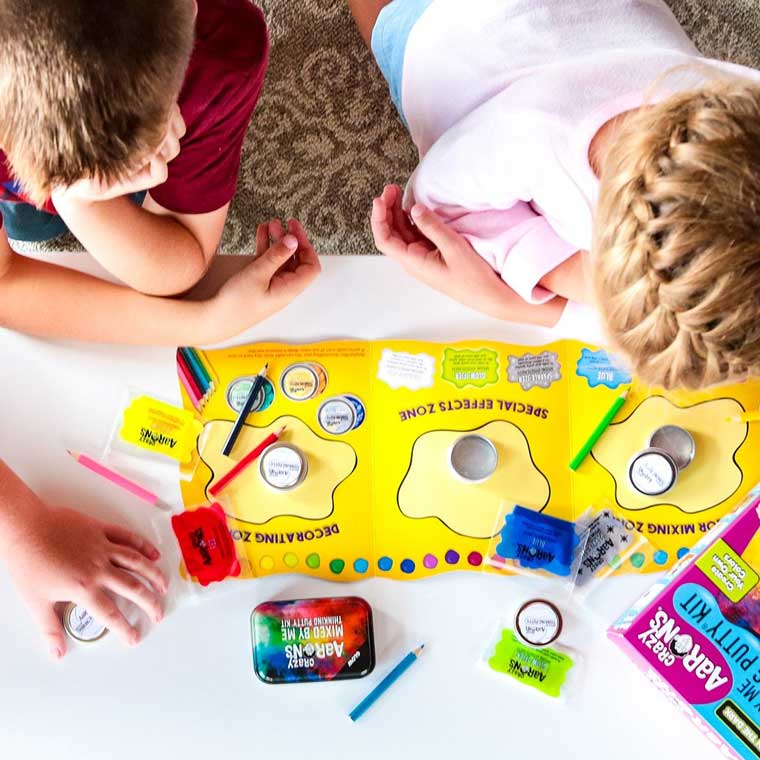 Crazy Aaron's Mixed by Me collection puts the power of creation in the palm of your hands! These awesome kits include 5 tins of clear Thinking Putty®, six bags of color and/or special effect putties, colored pencils, labels, a tin to hold all your components and a dual instructional mat—everything you’ll need to make custom colors that are all your own!