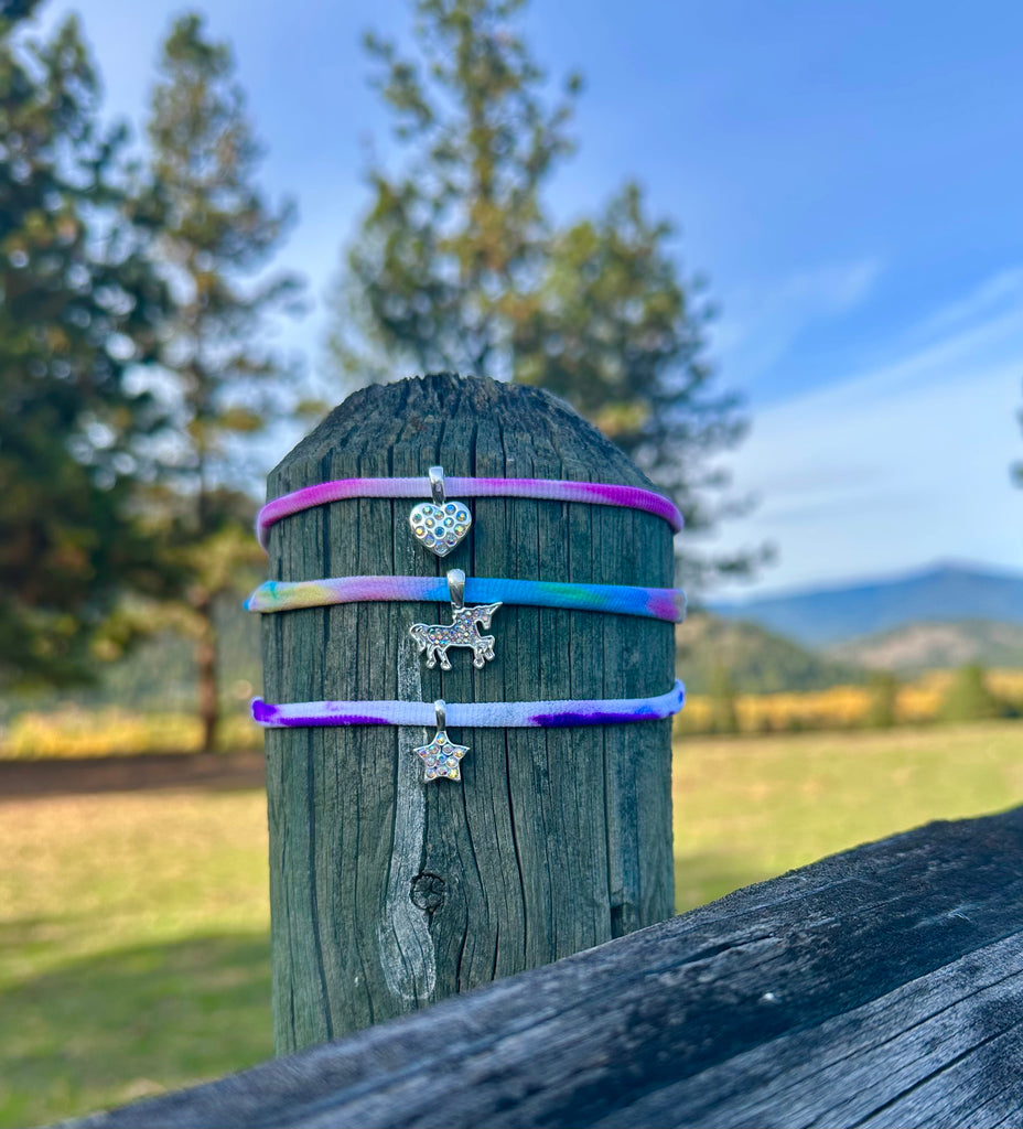 Swarovski Crystal charms are strung on solid or tie dye stretch fabric. Charms are approximately 1/2” to 3/4” tall. Chokers stretch to fit all sizes - no clasp. Assorted colors.